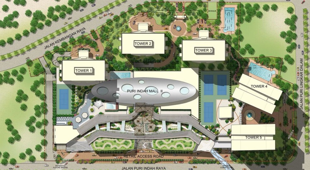 Puri Indah II is an addition to the successful Puri Indah Mall west of Jakarta, Indonesia. Puri Indah II features a four-level mall with five 40-story residential towers. The mall will include retail, dining and entertainment opportunities as well as an IMAX theater. A below-grade supermarket, and a large family entertainment center complete with indoor and outdoor components and a signature wave pool.
